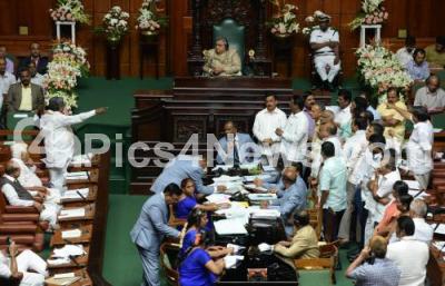 Photo Caption : CM Siidaramaiah seen arguing with the protesting BJP legislatures for the recent Diary controversy during the Assembly Session at Vidhan Soudha, in Bengaluru on Friday 17th March 2017