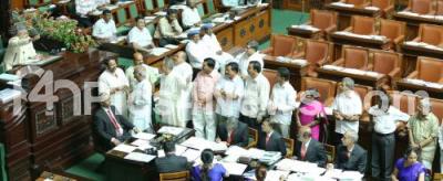 Photo Caption : Opposition party MLAs protesting during a Assembly session at Vidhana Soudha, in Bengaluru on Monday 20th March 2017