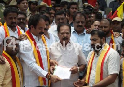 Karnataka Rakshana Vedike staged a protest against the remarks made by Tamil Actor Satyaraj on Cauvery issue and opposing the release of movie Baahubali 2 in Karnataka and submitted a memorandum to Sa Ra Govind at Karnataka Film Chamber, in Bengaluru on Tuesday 21st March 2017