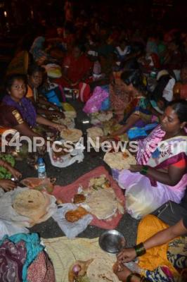 Photo Caption : Protesting Anganwadi workers seen having their dinner and to sleep on Sheshadri Road for the 2nd night under tight police security, as they are demanding for higher wages, in Bengaluru on Tuesday 21st March 2017