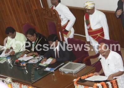 Photo Caption : MK Gunashekar, BBMP Taxation and Finance Committee Chairman presenting the BBMP Budget during the Budget Session at Council Hall at BBMP Office in the presence of Mayor Padmavathi, Deputy Mayor Anand and Manjunath Prasad, BBMP Commissioner, in Bengaluru on Saturday 25th March 2017