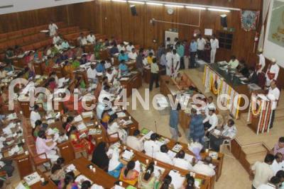 Event Description : MK Gunashekar, BBMP Taxation and Finance Committee Chairman presenting the BBMP Budget during the Budget Session at Council Hall at BBMP Office in the presence of Mayor Padmavathi, Deputy Mayor Anand and Manjunath Prasad, BBMP Commissioner, in Bengaluru on Saturday 25th March 2017
