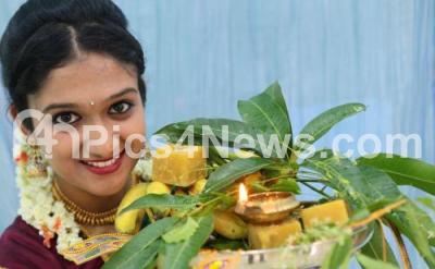 Photo Caption : Film Actor Rupika holding Bevu Bella (Neem and Jaggery) in traditional attire, on the eve of Ugadi festival, in Bengaluru on Tuesday 28th March 2017