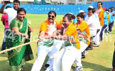 Photo Caption : Mayor Padmavati with Councilors playing tug of war during Mayor Cup Cricket match at PES College Grounds, in Bengaluru on Sunday 2nd April 2017
