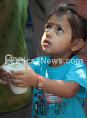Photo Caption : Children seen drinking Butter Milk on the occasion of Sri Ramanavami Festival at Sheshadripuram, in Bengaluru on Wednesday 5th April 2017