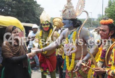 Photo Caption : Devotees dressed like Sri Rama and Hanuman distribute Panaka and Butter Milk, on the eve of Sri Ramanavami Festival near Anand Rao Circle, in Bengaluru on Wednesday 5th April 2017