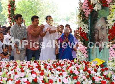 Photo Caption : Shiva Rajkumar, Ragavendra Rajkumar, Puneet Rajkumar and Rajkumar fans offering floral tribute to Senior Kannada Famous Actor Dr Rajkumar Samadi during his 11th death anniversary at Kanteerva Studio, in Bengaluru on Wednesday 12th April 2017