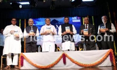 Union Minister Ravishankar Prasad with MN Venkatachalaiah, PJ Kurien, Rajya Sabha Deputy Chairperson and others releasing Sri M book “The Journey Continues, sequel to, Apprenticed to a Himalayan Master, A Yogi autobiography” at Bharatiya Vidya Bhavan, in Bengaluru on Saturday 22nd April 2017