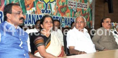Photo Caption : Union Ministers Nirmala Sitharaman, Ananth Kumar with BJP State President BS Yeddiyurappa and MLA Arvind Limbavali sen at a meeting at BJP office in Malleswaram , in Bengaluru on Sunday 23rd April 2017