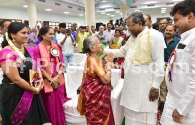 Photo Caption : CM Siddaramaiah interacting with Prof Kamala Balekundri wife of late Balekundri, during SG Balekundri award presentation programme at Banquet Hall, in Bengaluru on Friday 5th May 2017