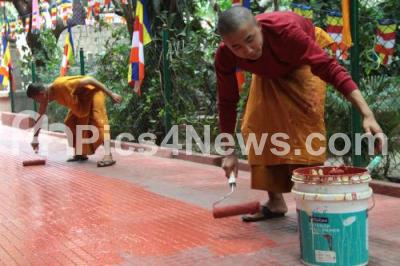 Photo Caption : Buddhist monks seen preparing for the upcoming Buddha Purnima at Mahabodhi Society, in Bengaluru on Tuesday 9th May 2017