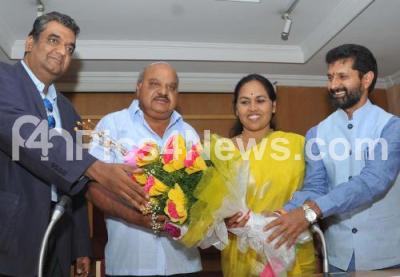Photo Caption : BJP leaders Shobha Karandlaje and CT Ravi greeting the newly elected Karnataka Coffee Board Chairman MS Boje Gowda, in Bengaluru on Wednesday 17th May 2017