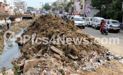Photo Caption : Debris dug up from the under construction rajakaluve is heaped up along the Rose Garden main road connecting Viveknagar and Austin Town, the road has not only become narrow, but the stench from the debris is giving the residents a nightmare, in Bengaluru on Wednesday 17th May 2017