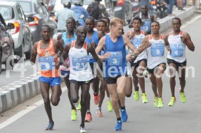 Photo Caption : International Men athletes winner Alex Korio, Runner Edwin Kiptoo and Second Runner Stephen Kissa in action in Men Elite 10 K during TCS World 10K 2017, in Bengaluru on Sunday 21st May 2017
