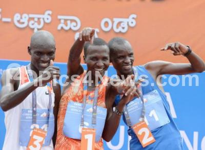 Photo Caption : International Men athletes winner Alex Korio, Runner Edwin Kiptoo and Second Runner Stephen Kissa seen jubilant during the Men Elite 10 K during TCS World 10K 2017, in Bengaluru on Sunday 21st May 2017