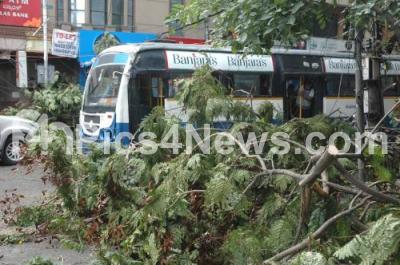 Photo Caption : A huge tree trunk uprooted on Dollars colony, Sanjaynagar Junction due to last night heavy wind and rainfall, in Bengaluru on Sunday 21st May 2017