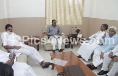 Photo Caption : CM Siddaramaiah with KC Venugopal, AICC general Secretary and In charge Party affairs Karnataka Congress, Dr G Parameshwar, KPCC President and other state Congress leaders held a meeting on the elicit information on the guidelines in preparation for the 2018 Assembly Elections at KPCC Office, in Bengaluru on Monday 22nd May 2017
