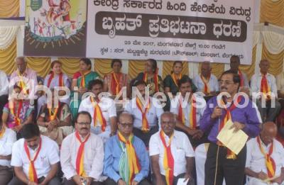 Photo Caption : Dr Manu Baligar with Karnataka senior writers Chandrashekar Patil, Mayanna and others staged a protest against the Central Government for hyping the Hindi Language in Karnataka, organised by Karnataka industry and Commercial Kannada Associations, in Bengaluru on Tuesday 23rd May 2017