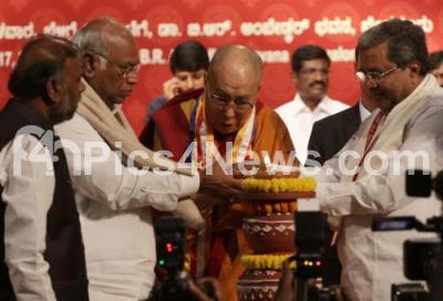 Photo Caption : Tibetan spiritual Dalai Lama with CM Siddaramaiah, Congress Leader Mallikarjuna Kharge, Minister Anjaneya and others inaugurated the State Level Seminar on Social Justice and Dr BR Ambedkar at Amabedkar Bhavan, organised by Dept of Social Welfare, in Bengaluru on Tuesday 23rd May 2017
