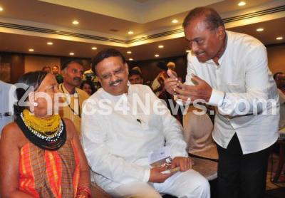 Photo Caption : Legendary Singer Dr SP Balasubrahmanyam with Music composer Hamsalekha and Shree Sukri Bomma Gowda seen interacting during the launch of IYDANI a redefine folk tradition of India, in Bengaluru on Saturday 27th May 2017