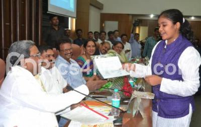 Photo Caption : Student submitting a memorandum to CM Siddaramiah during Children discussion program on Health and Education with CM Siddaramaiah organised by Karnataka State Children Rights Protection Commission and UNICEFF at Vikasa Soudha, in Bengaluru on Thursday 1st June 2017