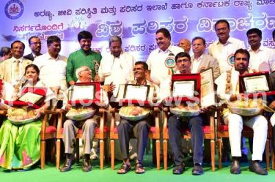 Photo Caption : CM Siddaramaiah with Minister Ramanath Rai presented the Karnataka State Environment Awards on the occasion of World Environment Day 2017 at GKVK, organised by Depat of Forest, Ecology and Environment, in Bengaluru on Monday 5th June 2017