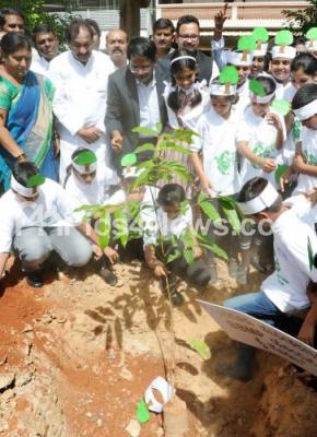 Photo Caption : MLA KJ George, Mayor Padmavathi and BBMP Commissioner Manjunath kick start the Vanamahothsava 2017, a massive sapling planting drive on occasion of World Environment Day 2017 at BBMP park at Kalyan nagar, HRBR Layout, many school students, children, youth, residents of the area, senior citizens and corporate employees participated in large numbers and planted saplings, in Bengaluru on Monday 5th June 2017