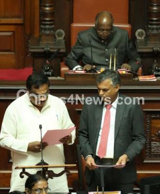 Photo Caption : Newly elected Congress MLC PR Ramesh, seen swearing in the presence of DH Shankarmurthy, Council Chairman, during the Council Session at Vidhan Soudha, in Bengaluru on Monday 5th June 2017