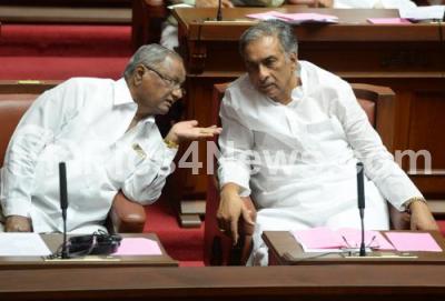 Photo Caption : JDS MLC Basavaraj Horatti seen in a serious conversation with BJP MLC Shanappa during the Council Session at Vidhan Soudha, in Bengaluru on Wednesday 7th June 2017