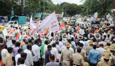 Farmers wing of the KPPC protest by staging a dharna in front of Bangalore Cantonment Railway station and attempting to enter into the station for a rail roko protest on Thursday, against the BJP government for using police force and brutality against protesting farmers at Mandsaur in Madhya Pradesh, in Bengaluru on Thursday 8th June 2017