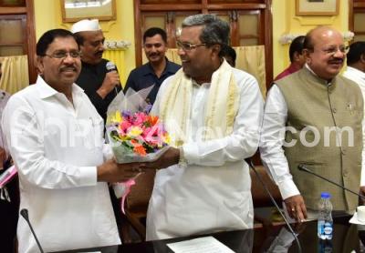 Photo Caption : CM Siddaramaiah seen greeting Dr G Parameshwar and other Congress leaders during the Congress Legislature Party meeting at Vidhan Soudha, in Bengaluru on Friday 9th June 2017