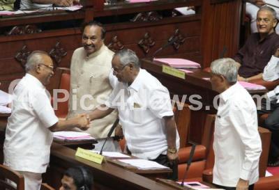 Photo Caption : Newly elected Congress MLC CM Lingappa being greeted by other MLCs during the Council Session at Vidhan Soudha, in Bengaluru on Saturday 13th June 2017