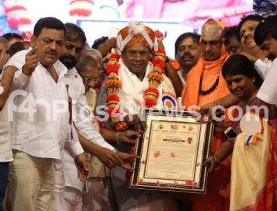 Photo Caption : CM Siddaramaiah being felicitated by Suttur Seer Shivarathri Deshikendra Swamiji, Shamanur Shivashankarappa, Minister Eshwar Khandre and others during the All India Veerashaiva Mahasabha at Palace Grounds, in Bengaluru on Wednesday 14th June 2017