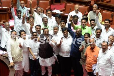 Chairman of the Legislative Council DH Shankaramurthy celebrating with supporters of JDS and BJP after winning the trust votes during council session at Vidhana Soudha, in Bengaluru on Thursday 15th June 2017