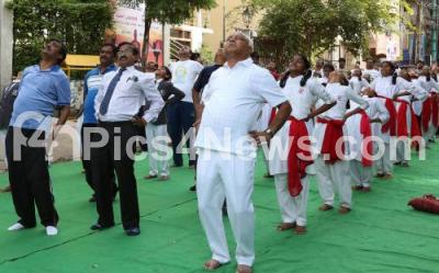 Event Description : BJP State President BS Yeddyurappa and Students performs Yoga during International Yoga Day at BJP Office, in Bengaluru on Wednesday 21st June 2017