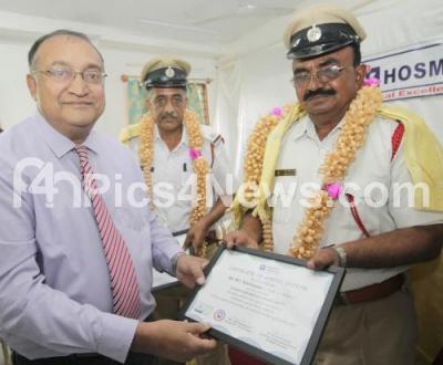 Event Description : Ulsoor Traffic Officers Sub Inspector Nijalingappa and Assistant Sub Inspector Suresh being presented with “The HOSMAT GOOD SAMARITIAN AWARD” for their exemplary action clearing the way and allowing a an Ambulance to pass carrying an emergency patient even as a convoy of the President of India was to soon pass through a busy Trinity junction under Ulsoor traffic jurisdiction, the awards were presneted by Dr Thomas Chandy, Chairman and Chief of Orthopaedics, HOSMAT Hospital, in Bengaluru on Friday 23rd June 2017