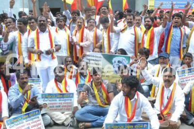Photo Caption : Members of Karnataka Rakshana Vedike led by TA Narayan Gowda staged a protest against the use of other languages and to give importance to Kannada language at Metro stations, the protest was held in front of the BMRCL office , in Bengaluru on Friday 23rd June 2017