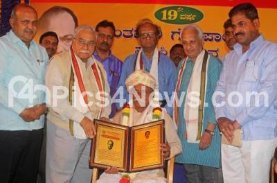 Photo Caption : Jnanapeetha awardee Chandrashekhar Kambar presenting “Shantaveri Gopalgowda†award to Rachappa Doolappa Hadapada at a programme organized by Kannada Janashakthi Kendra at Kannada Sahitya Parishat, also seen are Prof Chandrashekar Patil and others, in Bengaluru on Sunday 25th June 2017