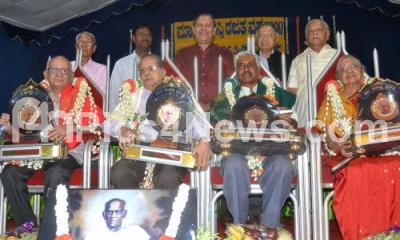 Photo Caption : Justice N Santosh Hegde presenting "Maasti" awards to Prof BH Nayaka, Prof Aa Ra Mitra, Prof Giraddi Govindaraja, Neeladevi at Hotel Woodlands , also seen are Dr TV Venkatala Shastri, Mavinekere Ranganathan and others, in Bengaluru on Sunday 25th June 2017
