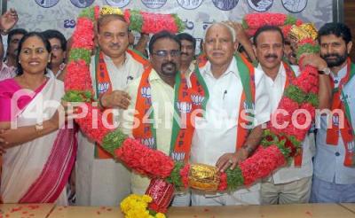 Photo Caption : Congress leader KP Nanjundi joined today BJP party in the presence of Union Ministers Ananth Kumar, DV Sadananda Gowda, BJP State President BS Yeddyurappa, MP Shoba Karandlaje and MLA CT Ravi and others at BJP Office, in Bengaluru on Monday 26th June 2017