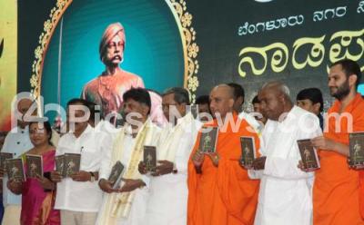 Photo Caption : Chief Minister of Karnataka Siddaramaiah with Nirmalananda Swamiji of Adichunchanagiri Mut , Former PM H D Devegowda , Union Minister DV Sadananda Gowda, Ministers D K Shivakumar, Umashree , MLC Revanna and others seen releasing a book on Kempegowda during Kempegowda Jayanthi at Banquet Hall, Vidhana Soudha, in Bengaluru on Tuesday 27th June 2017