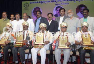 Photo Caption : Retired faculty members of Commerce and Management being felicitated by HD Devegowda, JDS Supremo with NH Shivashanakara Reddy, Deputy Speaker at the Karnataka Legislative Assembly, Marithibbegowda, Deputy Speaker at the Karnataka Legislative Council and others during the felicitation program to retired faculty members of Commerce and Management and Annual General Body Meeting organised by Bangalore University Teachers Council of Commerce and Management at Jnana Jyothi Auditorium, in Bengaluru on Wednesday 28th June 2017
