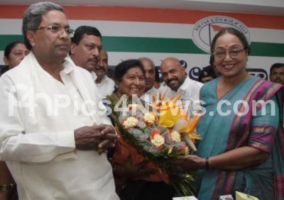 Photo Caption : Presidential candidate Meira Kumar being greeted by Mayor Padmavathi in the presence of CM Siddaramaiah and others at KPCC Office during her visit, in Bengaluru on Saturday 1st July 2017