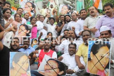 Photo Caption : Gandhinagar ward congress workers staged a protest against BJP leader Shobha Karandlaje for the personal remarks made on Gandhinagar MLA Dinesh Gundu Rao in front of Rajiv Gandhi Statue, Sheshadripuram, in Bengaluru on Thursday 13th July 2017