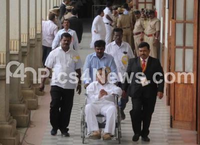 Photo Caption : MLA Rudresh Gowda seen arriving on a wheelchair to cast his vote for the President Election at Vidhan Soudha, in Bengaluru on Monday 17th July 2017