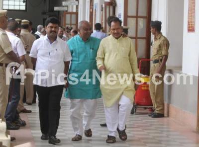 Photo Caption : BJP MLAs BY Raghavendra, Umesh Katti and others seen coming out of the polling booth after casting their vote for the President Election at Vidhan Soudha, in Bengaluru on Monday 17th July 2017
