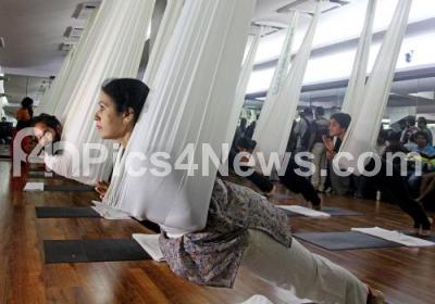 Photo Caption : Yoga enthusiasts seen displaying the flying bird yoga or the aerial yoga of Akshar Yoga, during a press conference at Akshar Yoga, Sadashivnagar, in Bengaluru on Tuesday 18th July 2017
