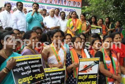 Photo Caption : Members of BJP Mahila Morcha led by BS Yeddyurappa staged a protest against the transfer of efficient police officer IPS officer, D Roopa and murder of RSS worker Sharath Madiwala, the protest was held at Gandhi Statue, Anand Rao Circle, in Bengaluru on Wednesday 19th July 2017