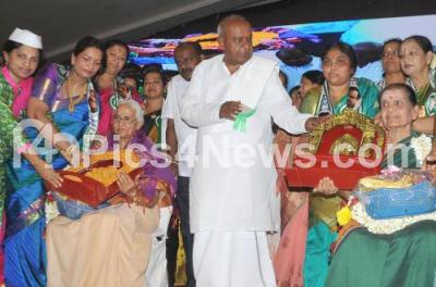 Photo Caption : Former Ministers Leela Devi R Prasad and BT Lalita Naik being felicitated by Former PM and JDS Supremo HD Devegowda and JDS State President HD Kumarswamy at the inauguration of the JDS Mahila Morcha convention at Palace Grounds, in Bengaluru on Thursday 20th July 2017