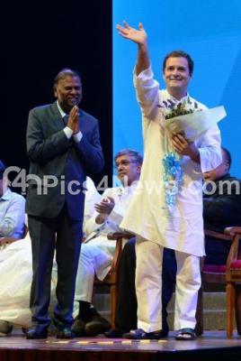 Photo Caption : AICC Vice President Rahul Gandhi seen waving to the crowd after being greeted by Minister Anjaneya at the Dr BR Ambedkar International Conference 2017 at GKVK Campus, in Bengaluru on Friday 21st July 2017